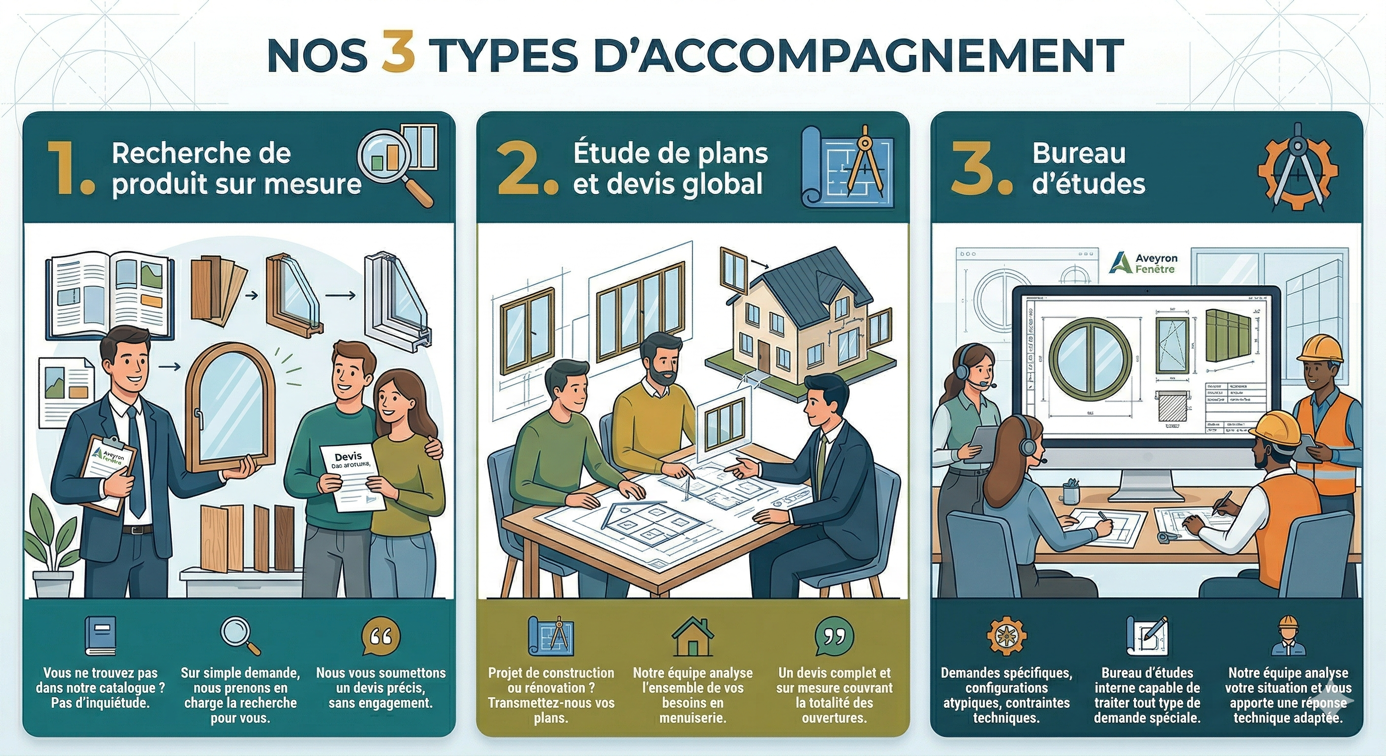Notre configurateur en ligne a été conçu pour répondre à la grande majorité des besoins en menuiserie sur mesure. Mais nous savons que certains projets sortent du cadre standard et méritent une attention particulière. C'est précisément pour cela que nous avons développé une offre d'accompagnement personnalisé, pensée pour vous apporter une solution adaptée, quelle que soit la complexité de votre demande.